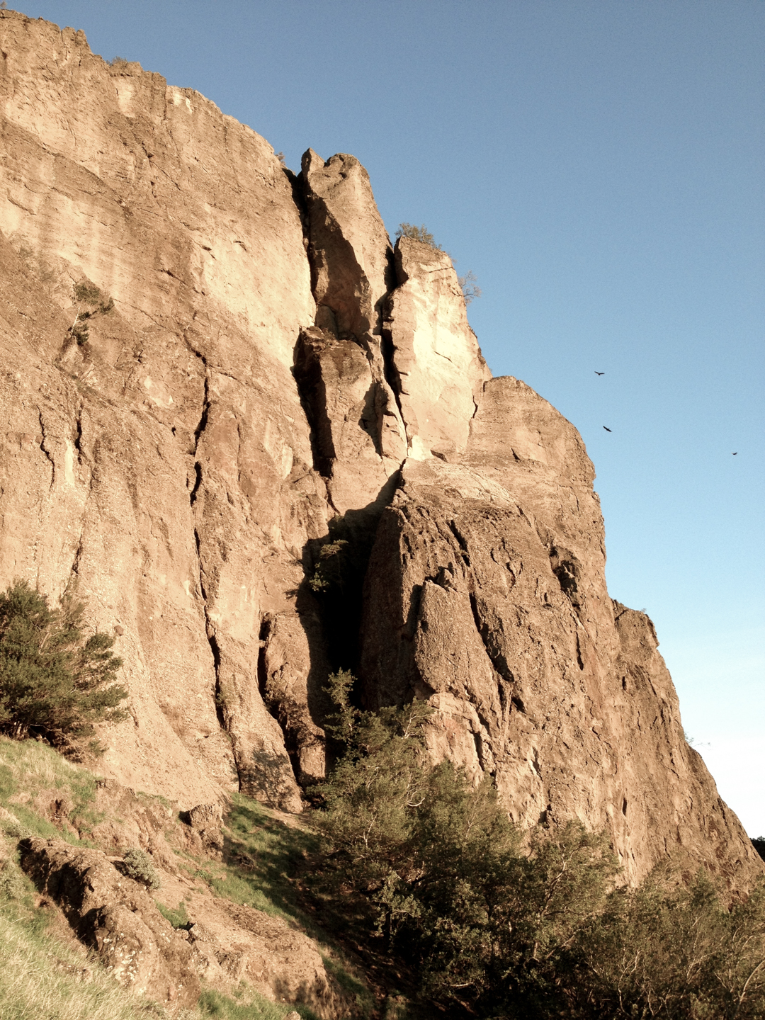 I have climbed several times at Mt. St Helena, mostly at the Bear and the Bubble, the most popular sport climbing crags of the area. The rock is either quartzite or igneous and isn’t of the best quality in the world, but the scenery is absolutely spectacular. Robert Louis Stevenson State Park is located right above Calistoga and offers some stunning views of the verdant green Napa Valley landscape below. This time, we decided to try something different and go to Table Rock, a decently big cliff (350 ft) of igneous rock. We heard that the hike is rather difficult and the rock is very chossy, but we decided to go for it anyways. We had the 4 pitch climb “Aloha Patrol” in mind.