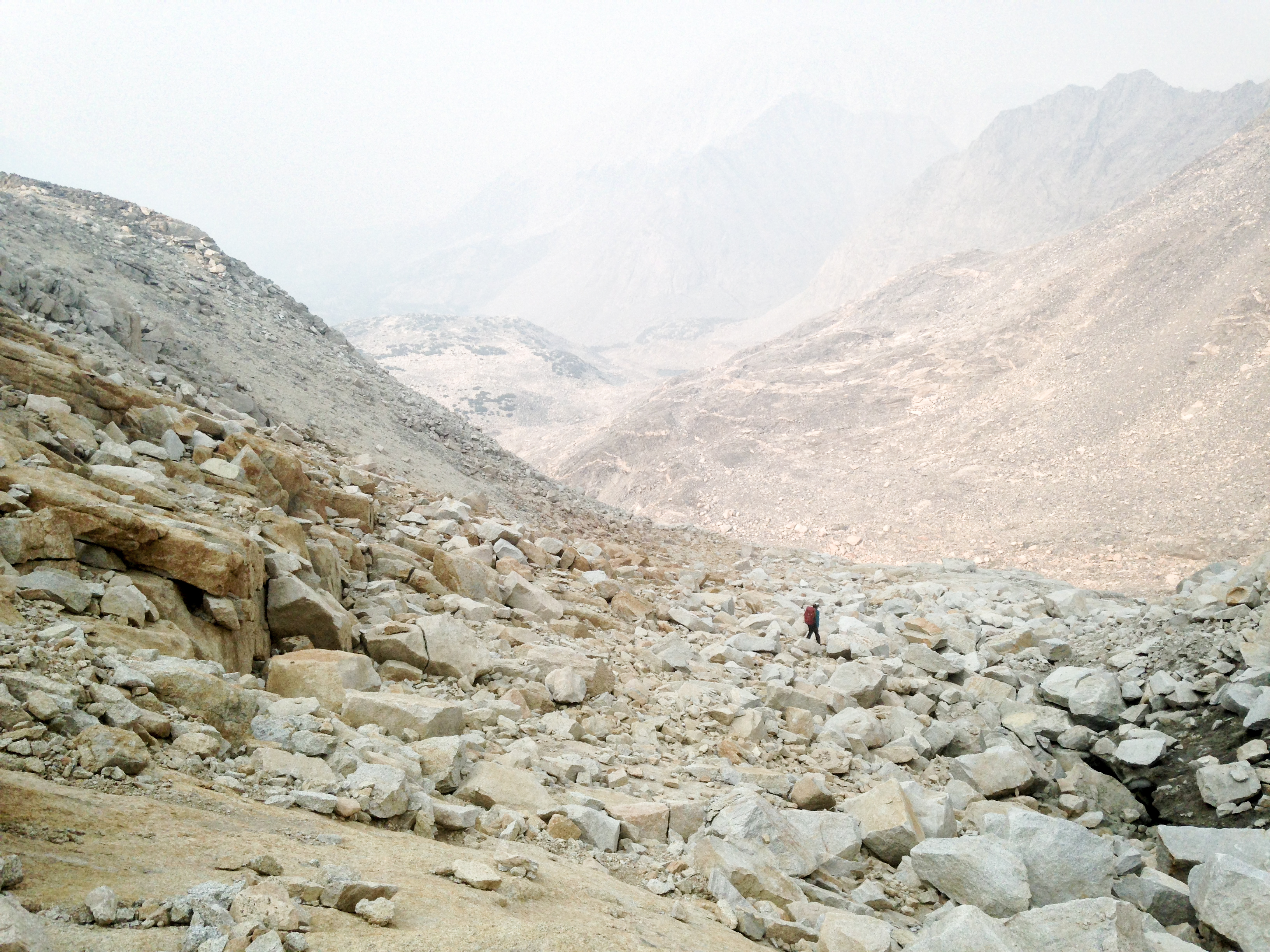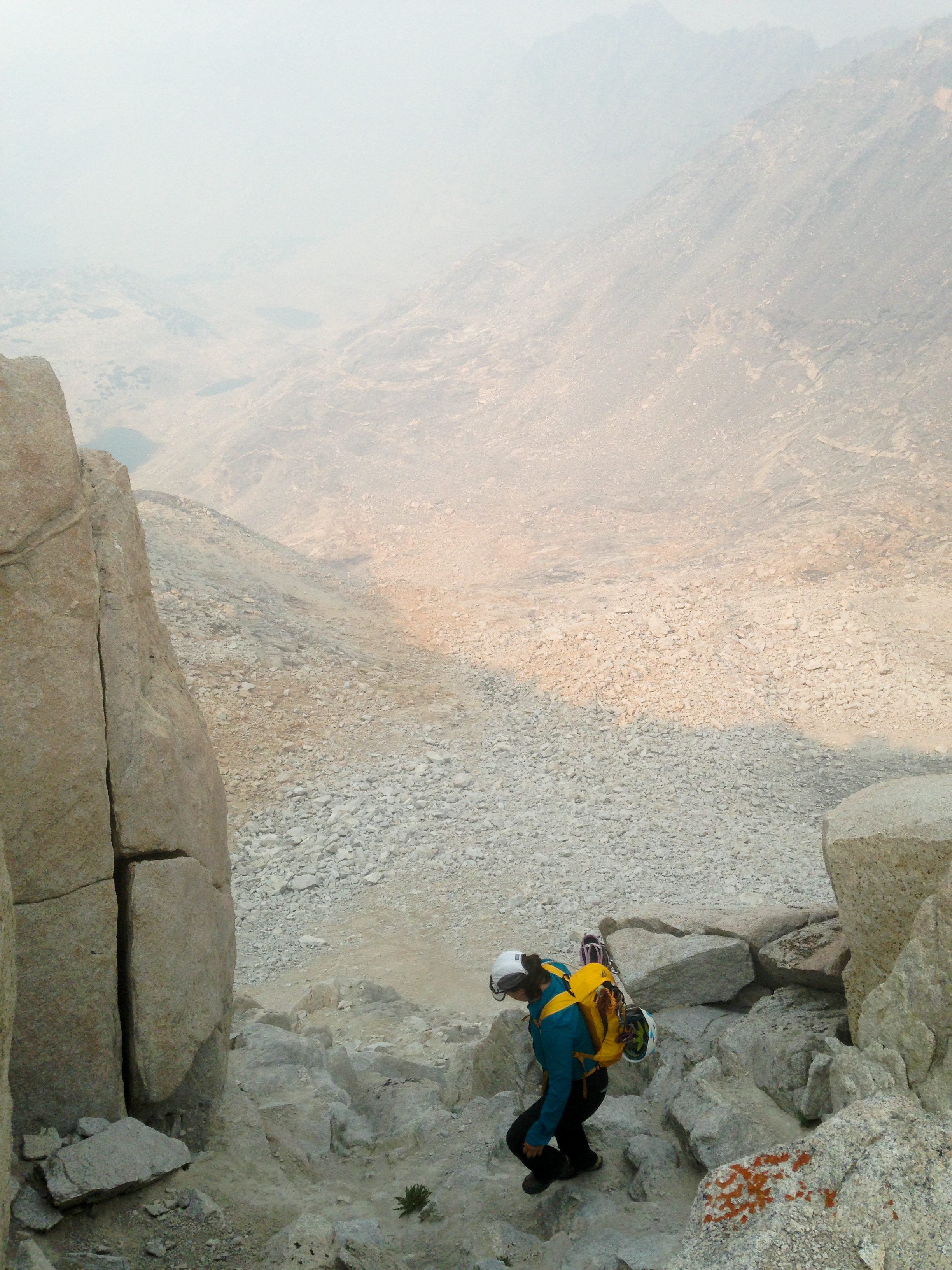 Unfortunately, all of the premonitions about this being one of California’s worst fire years to date came to light this summer. Four years of devastating drought has left our soils parched and replete with easily ignited dry fuel. When we climbed Bear Creek Spire, two massive fires were raging in the Sierra, (in addition to at least 20 or so more in the state, and plenty more on the entire west coast) creating hazy conditions that were only exacerbated as the winds changed during the day. Most people backpack into Dade lake and do the climb in 2 or 3 days, but we decided to do it car to car, because we are slightly masochistic (but really because we are both busy and didn’t want to haul in a bunch of stuff !) We were on the trail by 5 and fourteen hours later, at 7 PM, we were back at the parking lot, with sore legs and big apetites!